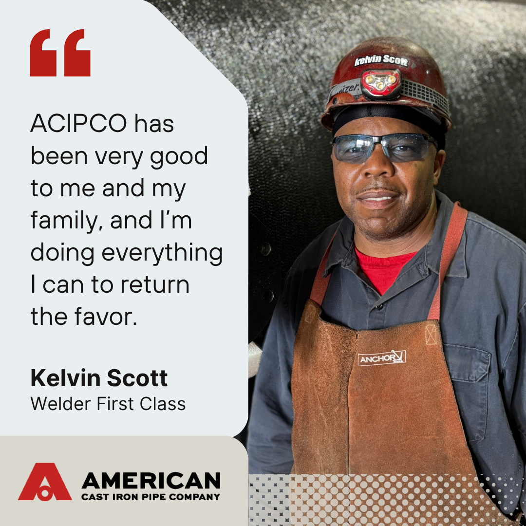 When Kelvin Scott learned about job opportunities at ACIPCO from an employee, he said it was the employee-owned company’s great benefits, career opportunities, competitive pay and culture that motivated him to pursue a new start in manufacturing.